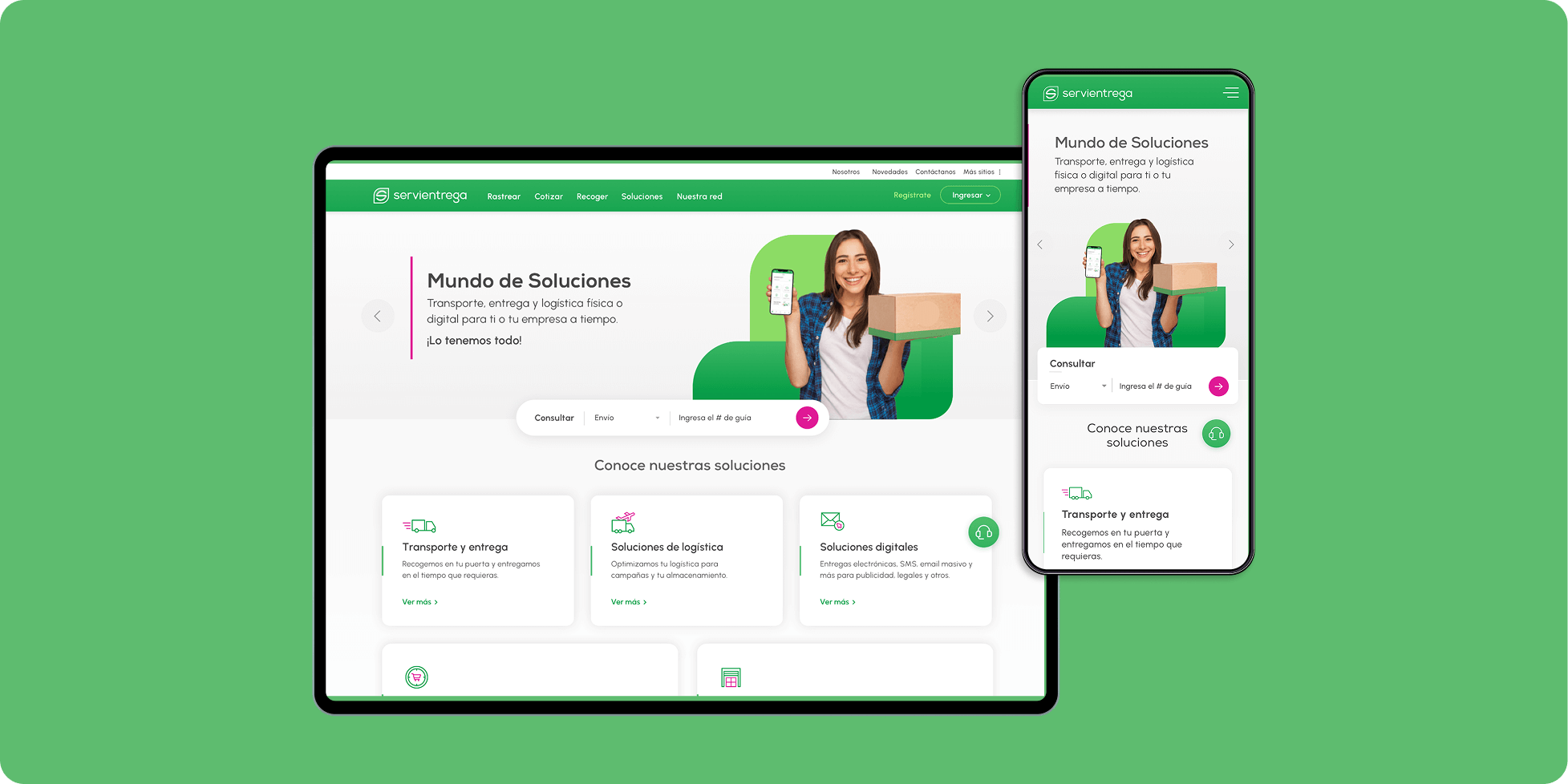 UZER lideró el rediseño integral de la presencia digital de Servientrega, incluyendo el sitio principal y los interfaces de rastreo de envíos. El proyecto se enfocó en trasladar visual y funcionalmente la identidad “Mundo de Soluciones” al entorno digital, con especial atención a la usabilidad de funcionalidades críticas como el rastreo de paquetes y la interacción con los servicios de logística.